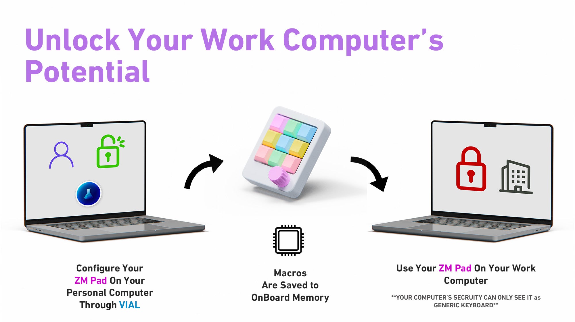 - Works with Locked down work computers (shows as a generic external keyboard)