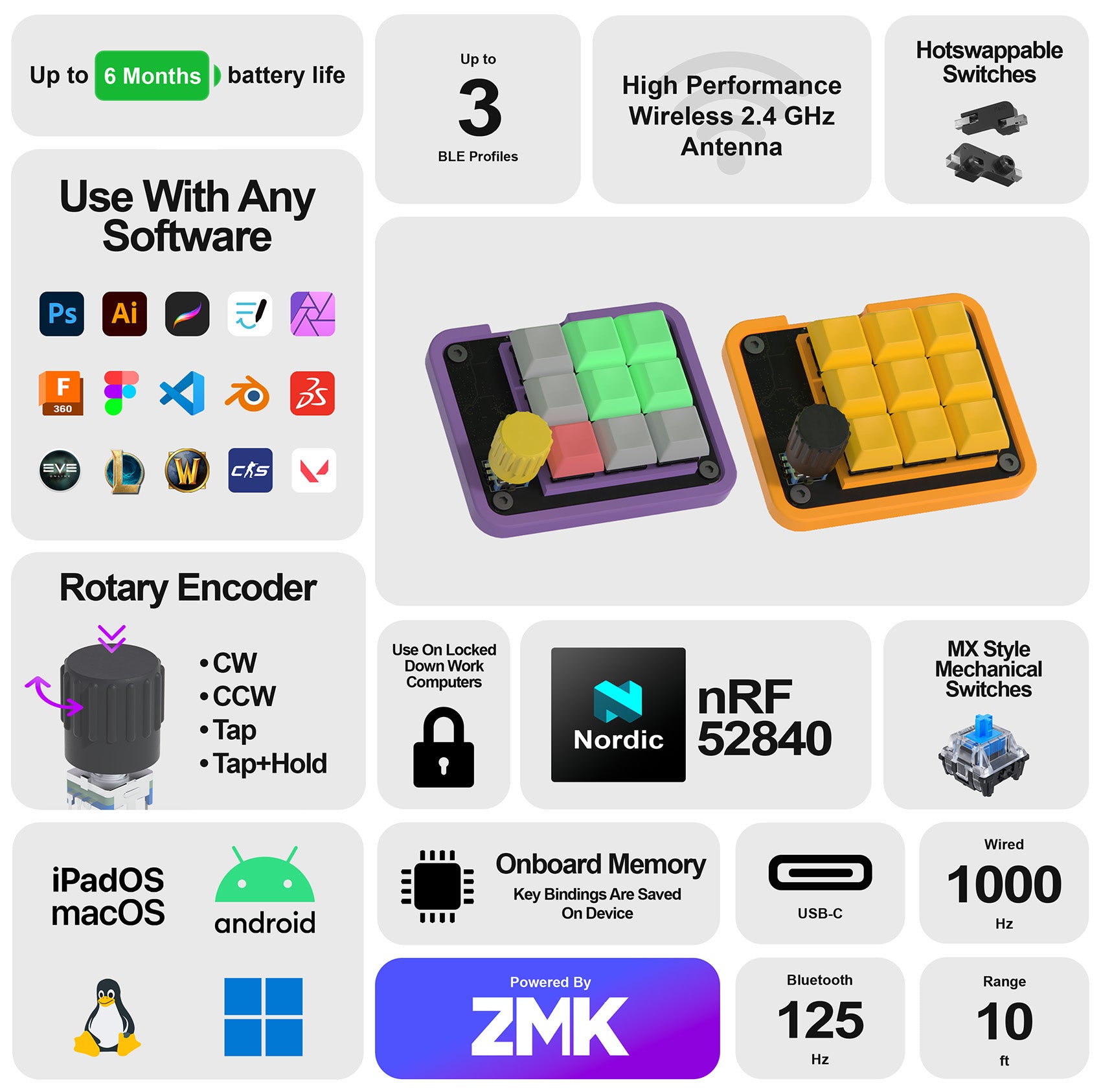 - Encoder/Dial's CW/CCW spinning behavior are set default to VolUp/VolDwn. Changing Encoder/Dial's behavior/action requires altering ZMK Code and Build/Flashing new firmware for the Macropad